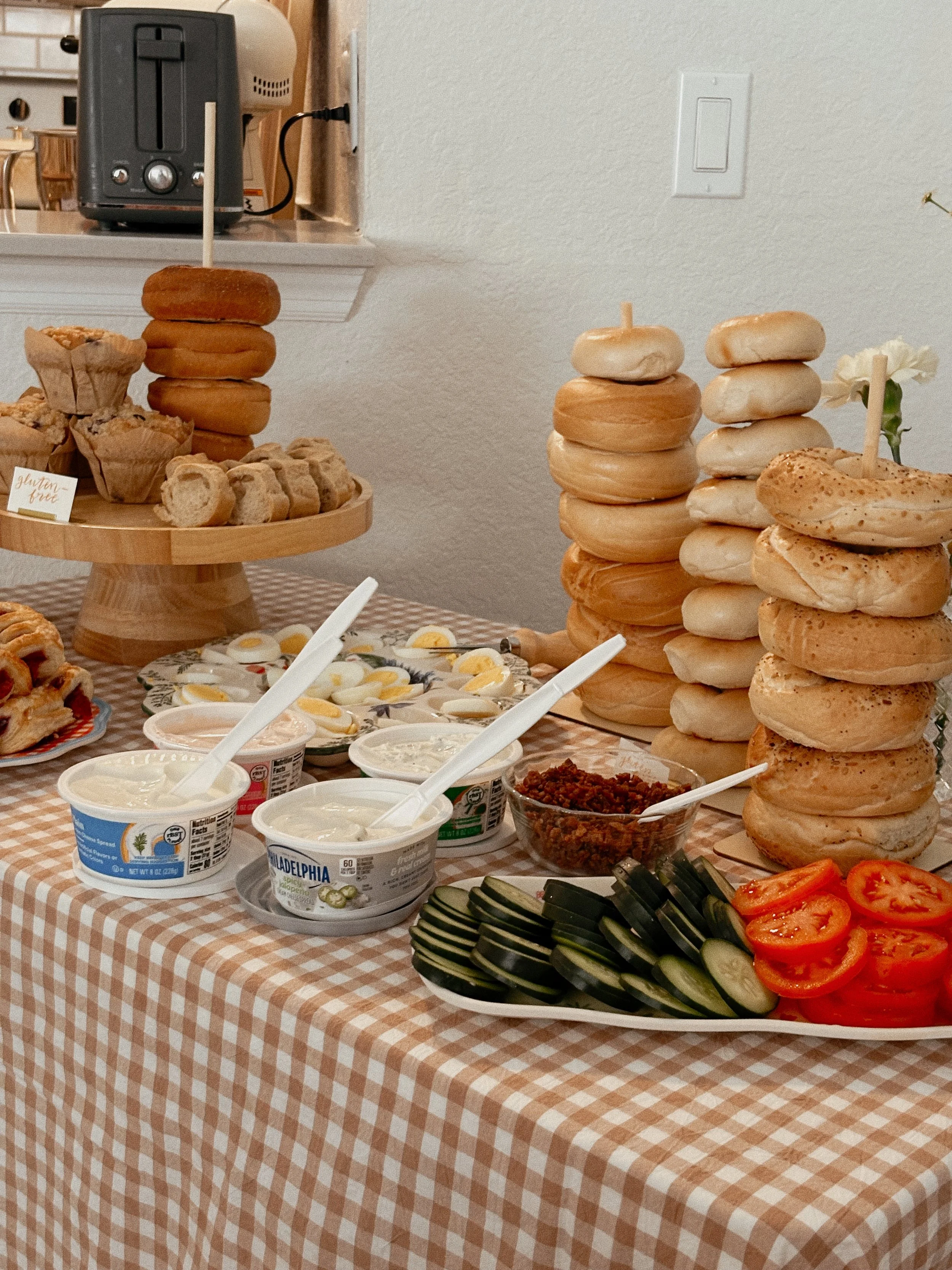 These bagel stands were key both aesthetically and practically! I didn’t have a whole lot of room (I am hosting in an apartment after all) so I needed to save space on the tables so these bagel stands were perfect for stacking the bagels instead of having to spread them out. Not only this, but it added height and variety to the table spread.